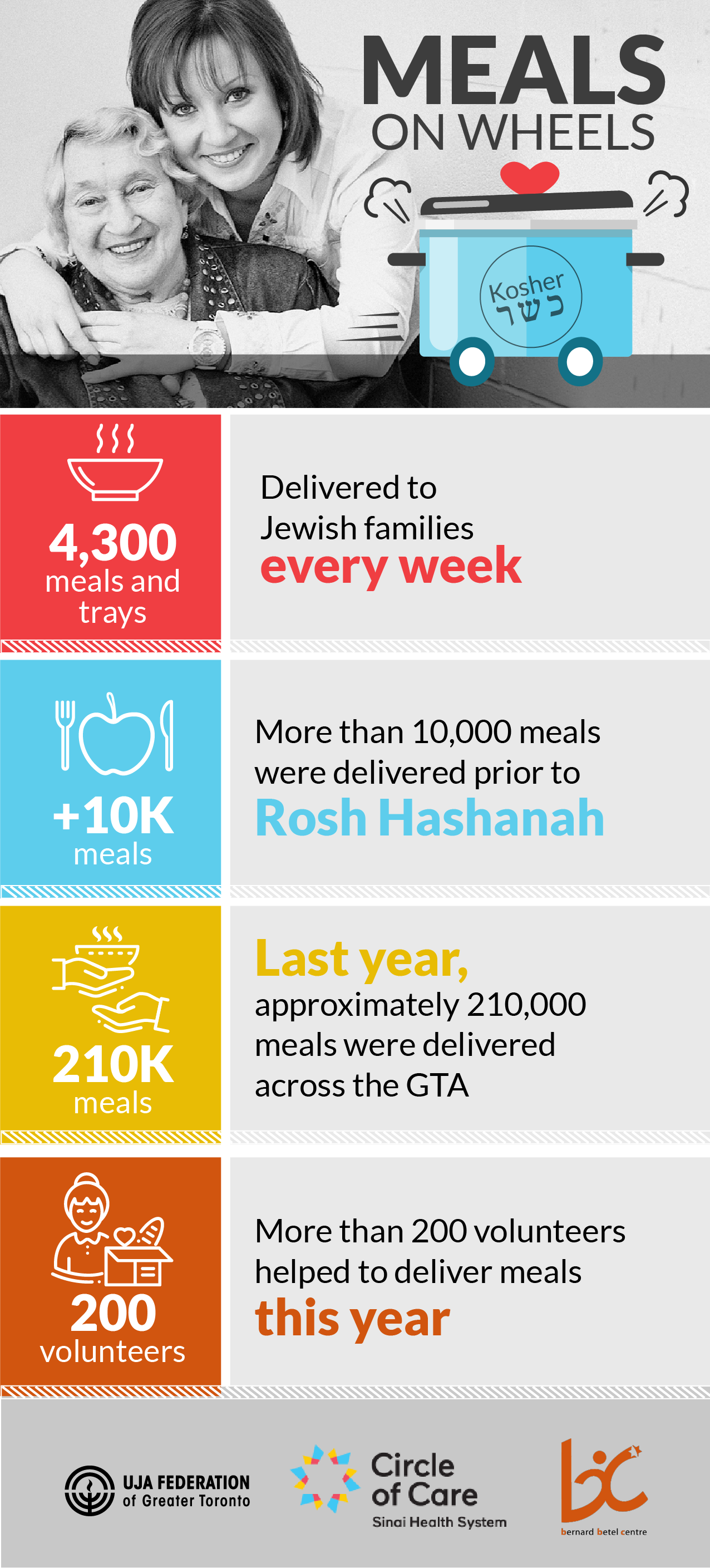 With funding support from UJA Federation, our partners agencies Circle of Care and The Bernard Betel Centre have helped provide thousands of Jewish seniors, survivors and those living in poverty with warm meals through their Kosher Meals on Wheels programs. In the week heading into Rosh Hashana alone, more than 10,000 meals were delivered to those in need. Combined, this is their impact: