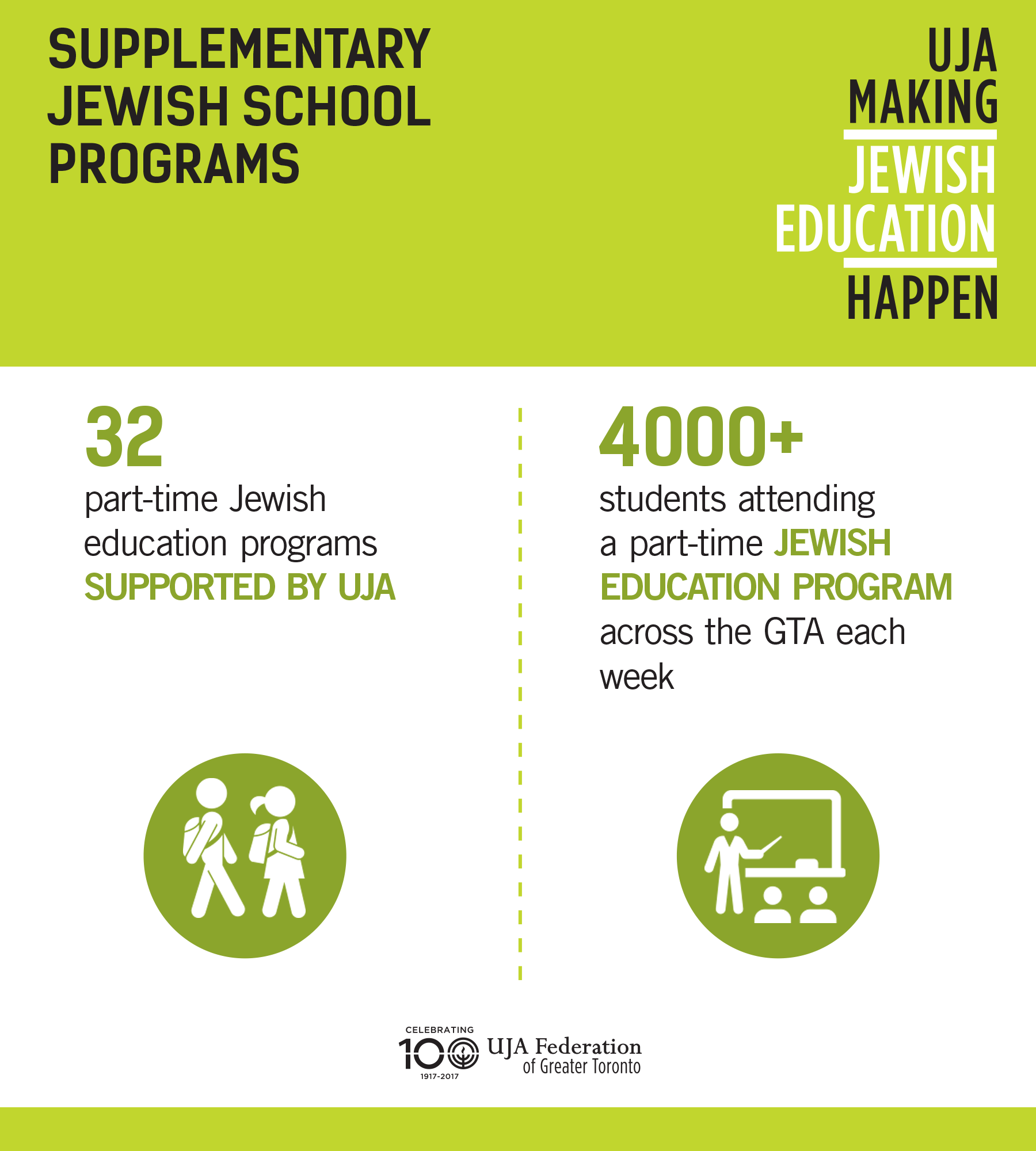 UJA is proud to support supplementary Jewish school programs in Toronto. One initiative we're especially excited about is WOW! Run by UJA's Koschitzky Centre For Jewish Education (CJE), WOW! is investing in new programs designed to engage students with no formal Jewish education. With your generous support, we can continue to improve the quality and expand the reach of supplementary Jewish education. Thank you for your support!