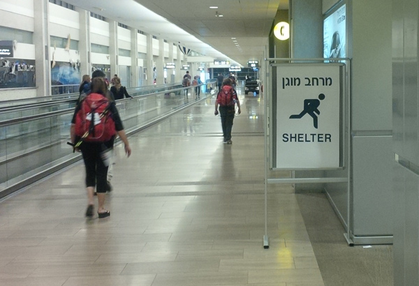 3:30am (July 24/14): I am at Ben Gurion Airport with several others on the Mission who are on the same flight. We had to change our flight from an Air France flight, Israel to Paris, to an El Al flight to Paris, where we will get connecting flights to Canada. Despite the fact that most non-Israeli carriers are not flying from Israel today, the airport is busy and full of life. The reality of war cannot be forgotten as shelter signs are everywhere.