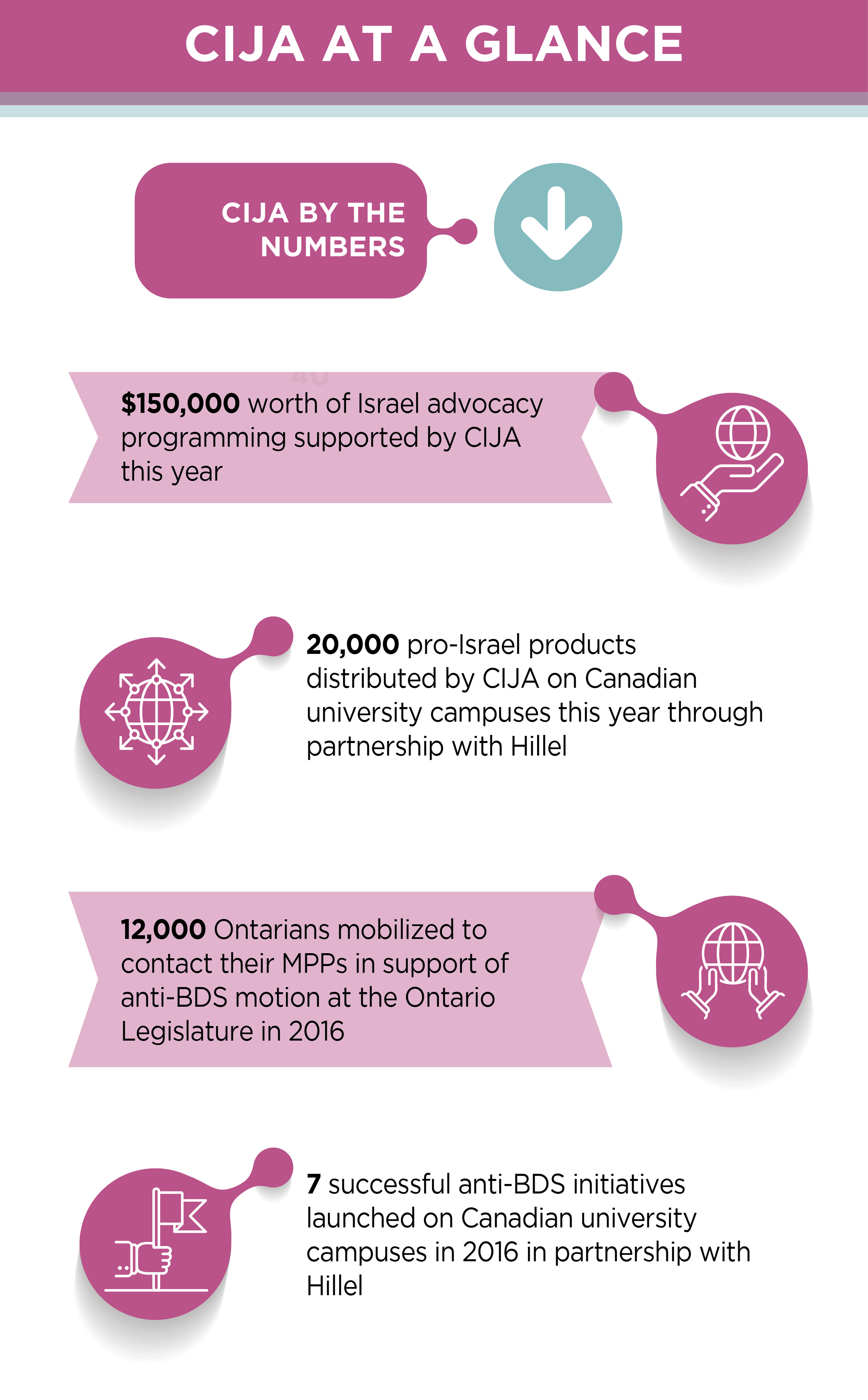 - 20,000 pro-Israel products distributed by CIJA on Canadian university campuses this year through partnership with Hillel