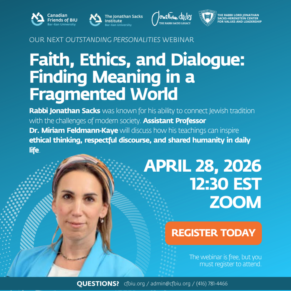 CFBIU Outstanding Personalities Webinar Series presents Dr. Miriam Feldmann-Kaye, from the Jonathan Sacks Institute and Assistant Professor at the BIU Department of Jewish Philosophy, as she brings complex ideas into practical conversations about identity, purpose and connection. Rabbi Sacks was known for his ability to connect Jewish tradition with the challenges of modern society. Dr. Feldmann‑Kaye, a Sacks Scholar and educator of his philosophy through a global online course, will discuss how his teachings can inspire ethical thinking, respectful discourse, and shared humanity in daily life.