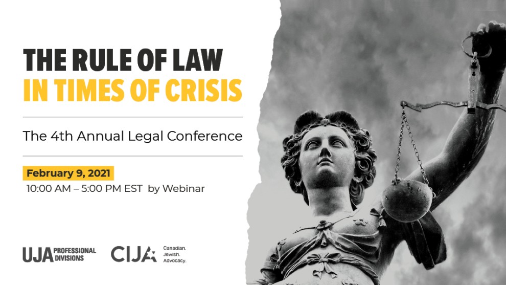 UJA and our advocacy agent the Centre for Israel and Jewish Affairs (CIJA) are pleased to present our fourth annual legal conference, the Rule of Law in Times of Crisis, by webinar this year. Join your peers from across Canada to hear about legal issues brought into sharp relief by recent world events that have impacted us all. An array of expert speakers and panelists will examine how times of crisis challenge the rule of law. Get your tickets today!