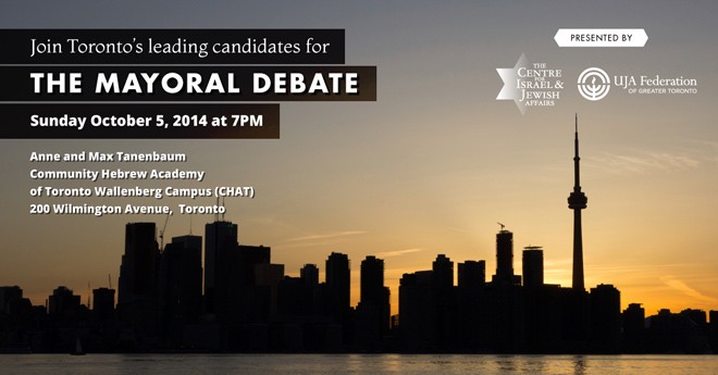 As Toronto’s most exciting mayoral race in recent history heats up prior to the October 27th election, we have a unique opportunity to hear directly from the leading candidates. UJA Federation of Greater Toronto and its advocacy partner the Centre for Israel and Jewish Affairs (CIJA) are hosting a mayoral debate to allow the leading candidates an opportunity to address our community in-person.