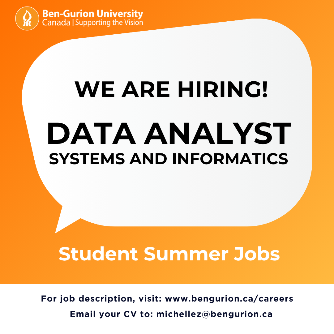 Are you a detail-oriented, analytical student and looking to gain hands-on experience in data analysis? Are you interested in making a positive impact? Join our team at Ben-Gurion University Canada as a Data Analyst this summer! This role offers an exciting opportunity to work with real data, contribute to meaningful projects, and develop valuable technical and analytical skills in a collaborative environment.