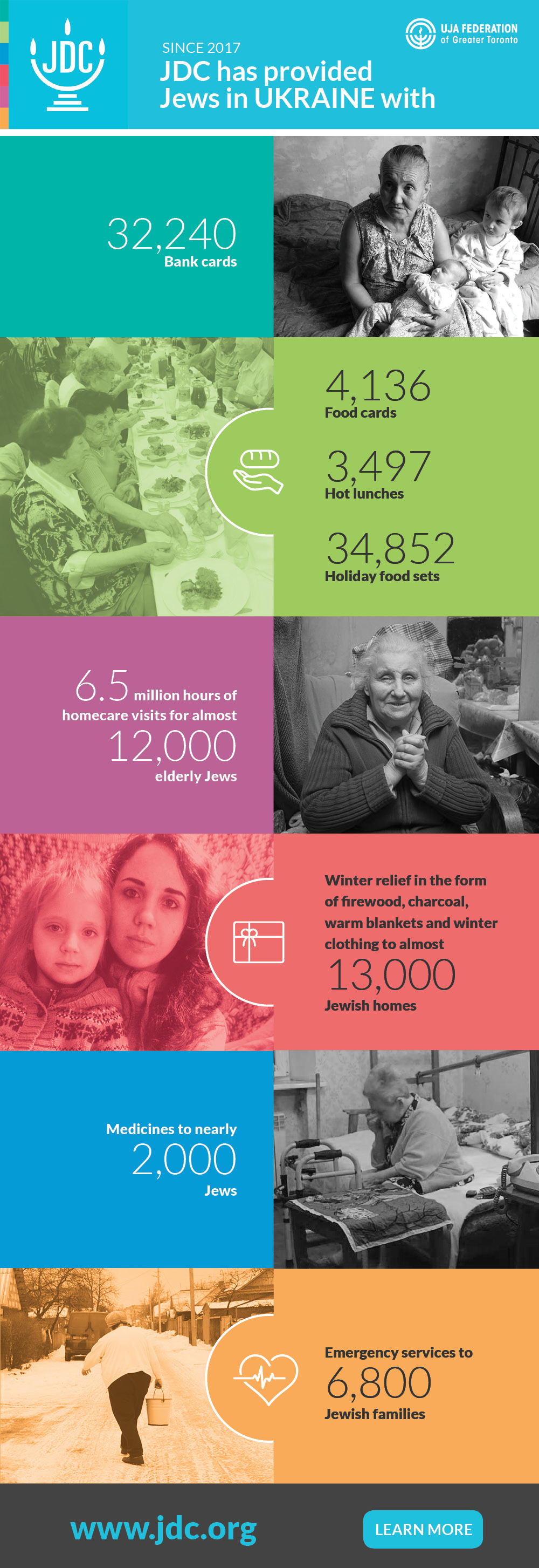 Tens of thousands of Jews around the world go to bed hungry every night. And tens of thousands of Jewish families struggle to make ends meet and secure a future for their children. UJA Federation of Greater Toronto, through the funding of its partner agency, the American Joint Distribution Committee (JDC), brings life-saving relief to Jews living in dire conditions in places where nearly no other social services exist.