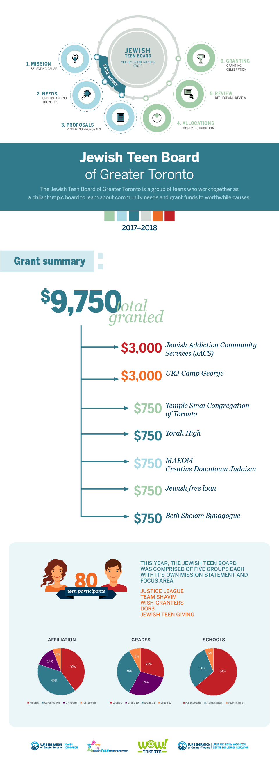 The Jewish Teen Board is a project-based learning experience in which teens run a real Foundation by selecting causes they care about facilitated through a meaningful and structured process. Participants are guided through the process of fundraising and taught about grant-making. The program culminates in a Granting Ceremony where students present the money raised to selected organizations.