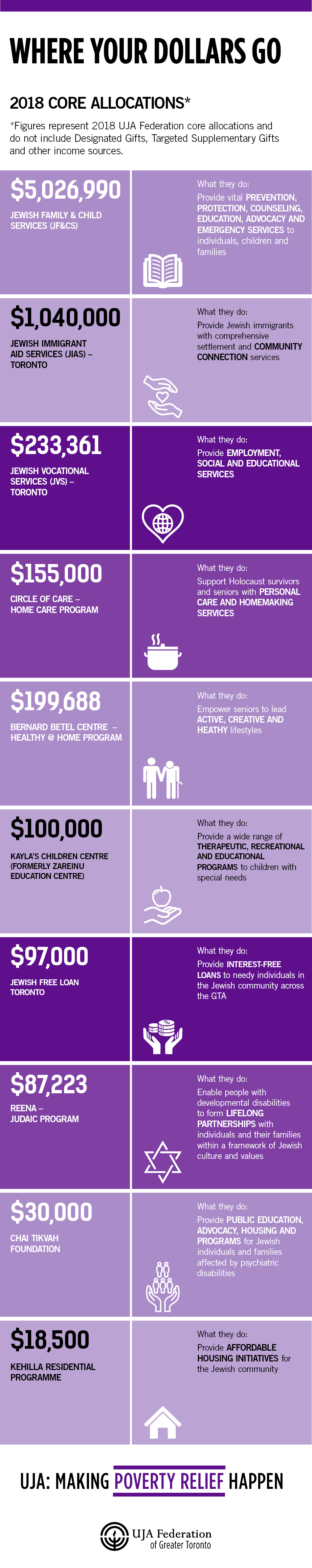 UJA is focused on the entire Jewish community’s health and vitality. As part of our commitment to transparency, this week we are highlighting some of our 2017/2018 core allocations to our partner organizations that are working to assist Jewish children, individuals and families in need. Thanks to your generous donations, we are able to continue our ongoing support of these remarkable programs and agencies.